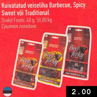 Kampaania periood: 30.06.2015 - 13.07.2015 Hind: 2.00€ Kuivatatud veiseliha Barbecue, Spicy Sweet või TraditionalSnakit Foods, 40 g