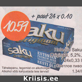 Kaup hele õlu saku originaal oli müügil allahindlusega Säästumarketi poes ajavahemikul 13.07.2015 kuni 19.07.2015 hinnaga 10.59 eurot.