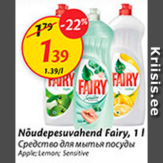 Kampaania periood: 28.07.2015 - 03.08.2015 Hind: 1.39€ Nõudepesuvahend Fairy, 1 lApple; Lemon; Sensitive