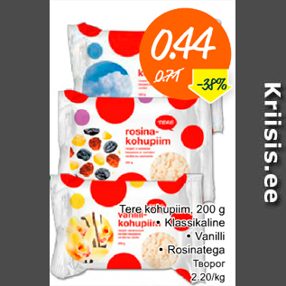 Kampaania periood: 10.08.2015 - 16.08.2015 Hind: 0.44€ Tere kohupiim, 200 g.Klassikaline .Vanilli .Rosinatega