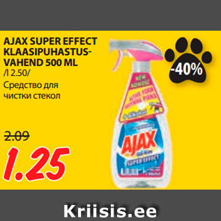 Toode ajax super effect klaasipuhastusvahend 500 ml oli müügil allahindlusega Maksimarketi ja Konsumi poodides ajavahemikul 02.09.2015 kuni 15.09.2015 hinnaga 1.25 eurot.