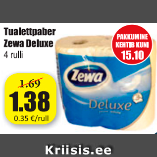 Kampaania periood: 02.10.2015 - 15.10.2015 Hind: 1.38€ Tualettpaber Zewa Deluxe4 rulli