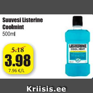 Kampaania periood: 06.11.2015 - 12.11.2015 Hind: 3.98€ Suuvesi Listerine Coolmint 500 ml