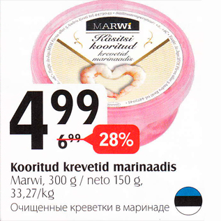 Kampaania periood: 15.12.2015 - 21.12.2015 Hind: 4.99€ Kooritud krevetid marinaadisMarwi, 300 g/neto 150 g