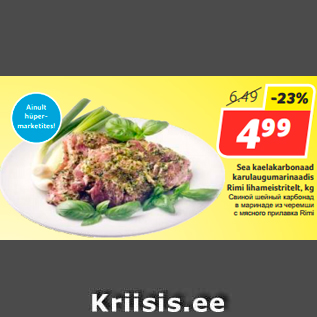 Kaup sea kaelakarbonaad karulaugumarinaadis rimi lihameistritelt, kg oli müügil allahindlusega Hüper Rimi poes ajavahemikul 01.03.2016 kuni 07.03.2016 hinnaga 4.99 eurot.