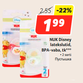 Kampaania periood: 22.03.2016 - 28.03.2016 Hind: 1.99€ NUK Disney latekslutid, BPA-vaba, tk***• 2 sorti