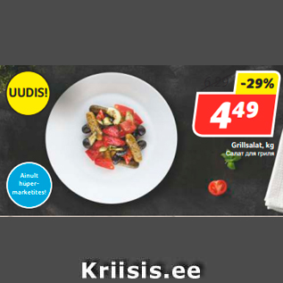 Kaup grillsalat, kg oli müügil allahindlusega Hüper Rimi poes ajavahemikul 10.05.2016 kuni 16.05.2016 hinnaga 4.49 eurot.