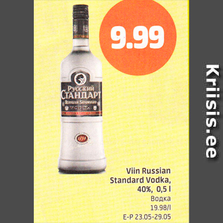 Kampaania periood: 23.05.2016 - 29.05.2016 Hind: 9.99€ Viin Russian Standard Vodka, 40%, 0,5 lKriisis.ee ei vastuta kommentaaride sisu eest. Autori arvamus võib kriisis.ee arvamusest erineda. Võimaluse korral jälgides kommentaare, kriisis.ee jätab endale õiguse kustutada neid põhjusi seletamata. Kui Teie olete sobimatu kommentaari märganud, palume meile sellest teatada.