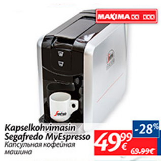 Toode kapselkohvimasin segafredo myespresso oli müügil allahindlusega Maxima Hüpermarketi poes ajavahemikul 24.05.2016 kuni 30.05.2016 hinnaga 49.99 eurot.