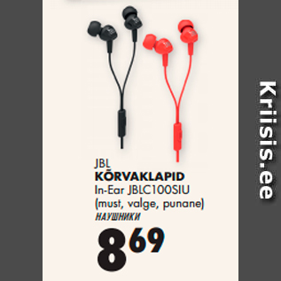 Kampaania periood: 19.08.2016 - 28.09.2016 Hind: 8.69€ JBL KÕRVAKLAPIDIn-Ear JBLC100SIU (must, valge, punane)