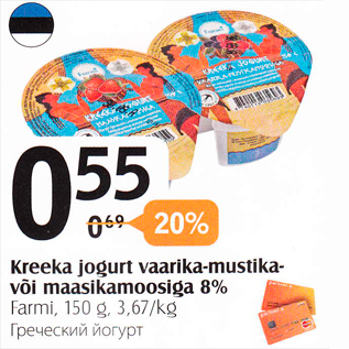 Kampaania periood: 27.09.2016 - 03.10.2016 Hind: 0.55€ Kreeka jogurt vaarika-mustika- või maasikamoosiga 8%Farmi, 150 g