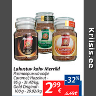 Kaup lahustuv kohv merrild oli müügil allahindlusega Maxima poes ajavahemikul 29.09.2016 kuni 03.10.2016 hinnaga 2.99 eurot.