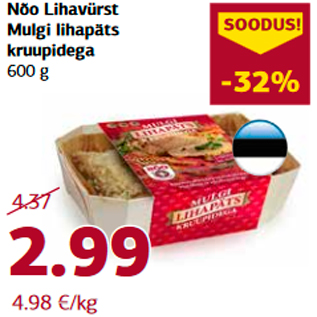 Kampaania periood: 03.11.2016 - 13.11.2016 Hind: 2.99€ Nõo Lihavürst Mulgi lihapäts kruupidega 600 g