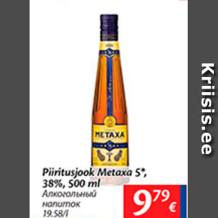 Kaup piiritusjook metaxa 5* oli müügil allahindlusega Maxima poes ajavahemikul 22.11.2016 kuni 28.11.2016 hinnaga 9.79 eurot.
