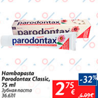 Toode hambapasta parodontax classic, 75 ml oli müügil allahindlusega Maxima poes ajavahemikul 03.01.2017 kuni 09.01.2017 hinnaga 2.75 eurot.