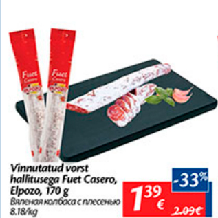 Kaup vinnutatud vorst hallitusega fuet casero, elpozo, 170 g oli müügil allahindlusega Maxima poes ajavahemikul 19.01.2017 kuni 23.01.2017 hinnaga 1.39 eurot.