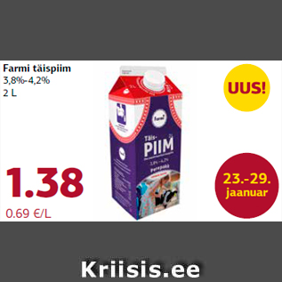 Kampaania periood: 23.01.2017 - 29.01.2017 Hind: 1.38€ Farmi täispiim3,8%-4,2%, 2 L