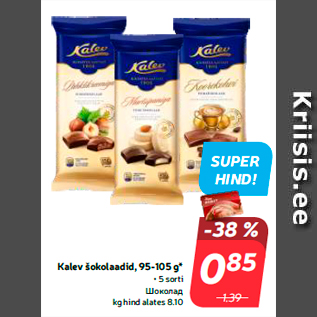 Kampaania periood: 24.01.2017 - 30.01.2017 Hind: 0.85€ Kalev šokolaadid, 95-105 g*• 5 sorti