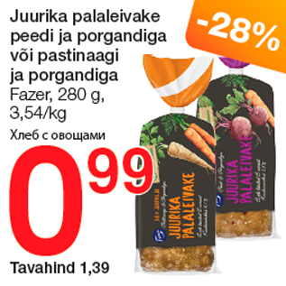 Kampaania periood: 28.02.2017 - 13.03.2017 Hind: 0.99€ Juurika palaleivake peedi ja porgandiga või pastinaagi ja porgandigaFazer, 280 g, 3,54/kg