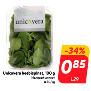 Kampaania periood: 14.03.2017 - 20.03.2017 Hind: 0.85€ Unicavera beebispinat, 100 g(v.a Vanalinna, Viru ja Tornimäe Rimis)
