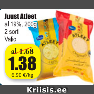 Kampaania periood: 07.04.2017 - 13.04.2017 Hind: 1.38€ Juust Atleetal 19%, 200 g; 2 sorti / Valio