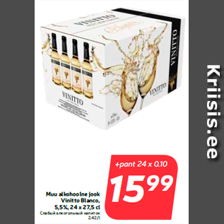 Kaup muu alkohoolne jook vinitto blanco, 5,5%, 24 x 27,5 cl oli müügil allahindlusega Hüper Rimi ja Rimi poodides ajavahemikul 20.06.2017 kuni 26.06.2017 hinnaga 15.99 eurot.
