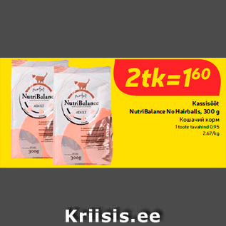 Kampaania periood: 26.09.2017 - 02.10.2017 Hind: 1.60€ Kassisööt NutriBalance No Hairballs, 300 g2tk=1,60; 1 toote tavahind 0.95