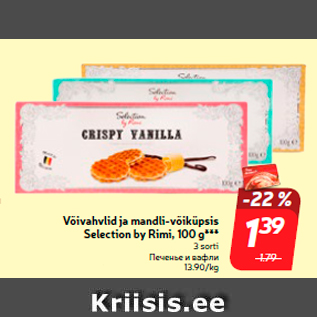 Kampaania periood: 21.11.2017 - 27.11.2017 Hind: 1.39€ Võivahvlid ja mandli-võiküpsis Selection by Rimi, 100 g***3 sorti