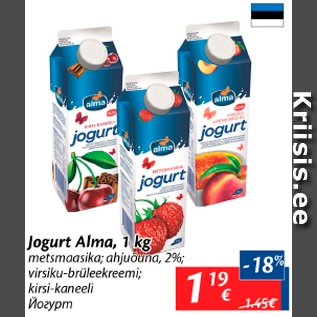 Kampaania periood: 21.11.2017 - 27.11.2017 Hind: 1.19€ Jogurt Alma, 1 kgmetsmaasika; ahjuõuna, 2%; virsiku-brüleekreemi; kirsi-kaneeli