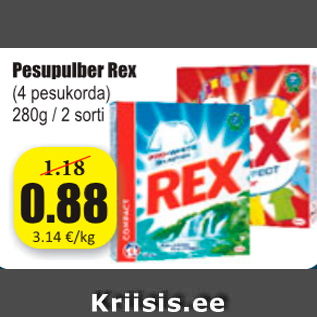 Kampaania periood: 16.02.2018 - 01.03.2018 Hind: 0.88€ Pesupulber Rex(4 pesukorda) 280 g / 2 sorti
