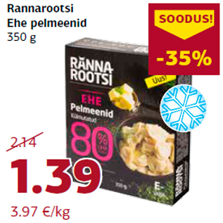 Kampaania periood: 21.06.2018 - 01.07.2018 Hind: 1.39€ Rannarootsi Ehe pelmeenid 350 g