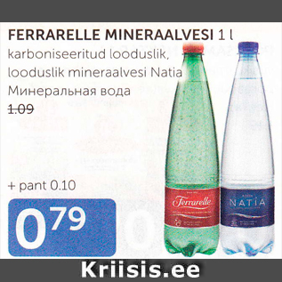 Kampaania periood: 01.07.2018 - 31.07.2018 Hind: 0.79€ FERRARELLE MINERAALVESI 1 Lkarboniseeritud looduslik, looduslik mineraalvesi Natia
