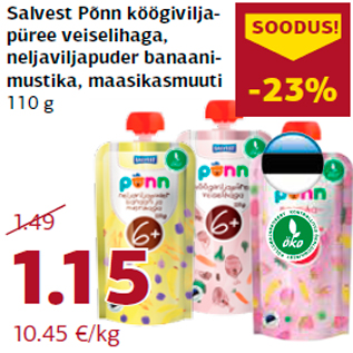 Kampaania periood: 19.07.2018 - 29.07.2018 Hind: 1.15€ Salvest Põnn köögiviljapüree veiselihaga, neljaviljapuder banaanimustika, maasikasmuuti 110 g