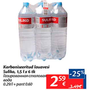 Kampaania periood: 31.07.2018 - 06.08.2018 Hind: 2.59€ Karboniseeritud lauavesi Suliko1,5 l x 6 tk