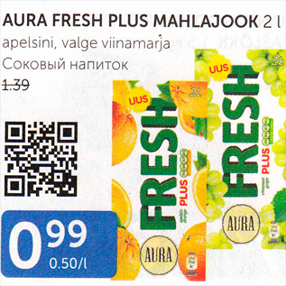 Kaup aura fresh plus mahlajook 2 l oli müügil allahindlusega Maksimarketi, Konsumi ja AjaO poodides ajavahemikul 14.08.2018 kuni 20.08.2018 hinnaga 0.99 eurot.
