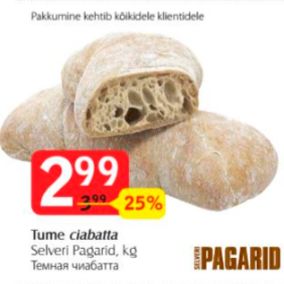Kampaania periood: 04.09.2018 - 17.09.2018 Hind: 2.99€ Tume ciabattaSelveri Pagarid, kg