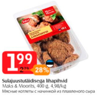 Kampaania periood: 04.09.2018 - 17.09.2018 Hind: 1.99€ Sulajuustutäidisega lihapihvidMaks&Moorits, 400 g