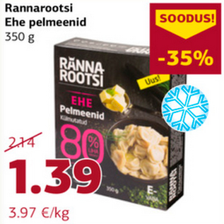 Kampaania periood: 18.10.2018 - 28.10.2018 Hind: 1.39€ Rannarootsi Ehe pelmeenid 350 g