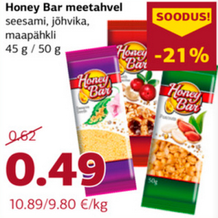 Kampaania periood: 18.10.2018 - 28.10.2018 Hind: 0.49€ Honey Bar meetahvelseesami, jõhvika, maapähkli 45 g / 50 g