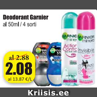Kampaania periood: 26.10.2018 - 01.11.2018 Hind: 2.08€ Deodorant Garnieral 50 ml / 4 sorti