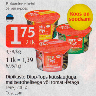 Kampaania periood: 06.11.2018 - 19.11.2018 Hind: 1.75€ Dipikaste Dipp-Tops küüslauguga, maitserohelisega või tomati-fetagaTere, 200 g