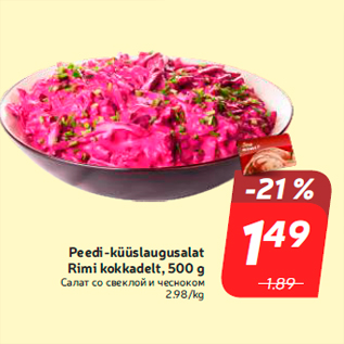 Kaup peedi-küüslaugusalat rimi kokkadelt, 500 g oli müügil allahindlusega Hüper Rimi, Rimi, Mini Rimi poodides ajavahemikul 20.11.2018 kuni 26.11.2018 hinnaga 1.49 eurot.