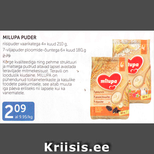 Kampaania periood: 11.12.2018 - 17.12.2018 Hind: 2.09€ MILUPA PUDERriisipuder vaarikatega 4+ kuud 210 g, 7-viljapuder ploomide-õuntega 6+ kuud 180 g