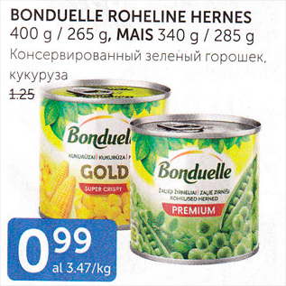 Kampaania periood: 18.12.2018 - 01.01.2019 Hind: 0.99€ BONDUELLE ROHELINE HERNES 400 G / 265 G, MAIS 340 G / 285 G