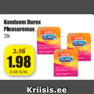 Kampaania periood: 21.12.2018 - 03.01.2019 Hind: 1.98€ Kondoom Durex Pleasuremax 3 tk