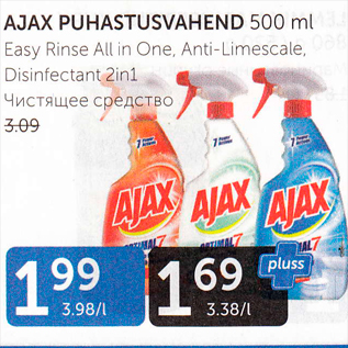 Kampaania periood: 22.01.2019 - 28.01.2019 Hind: 1.69€ AJAX PUHASTUSVAHEND 500 MLEasy Rinse All in One, Anti-Limescale, Disinfectant 2in1