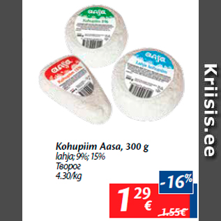 Kampaania periood: 29.01.2019 - 04.02.2019 Hind: 1.29€ Kohupiim Aasa, 300 glahja; 9%; 15%