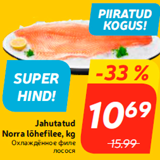 Kaup jahutatud norra lõhefilee, kg oli müügil allahindlusega Hüper Rimi, Rimi, Mini Rimi poodides ajavahemikul 29.01.2019 kuni 04.02.2019 hinnaga 10.69 eurot.