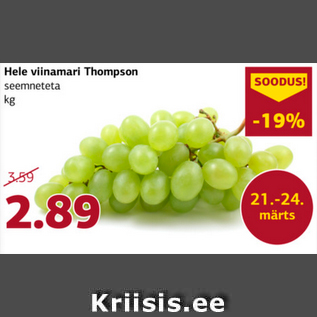 Kampaania periood: 21.03.2019 - 24.03.2019 Hind: 2.89€ Hele viinamari Thompsonseemneteta, kg