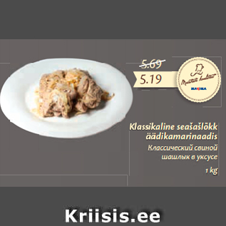Kampaania periood: 11.04.2019 - 24.04.2019 Hind: 5.19€ Klassikaline seašašlõkk äädikamarinaadis 1 kg